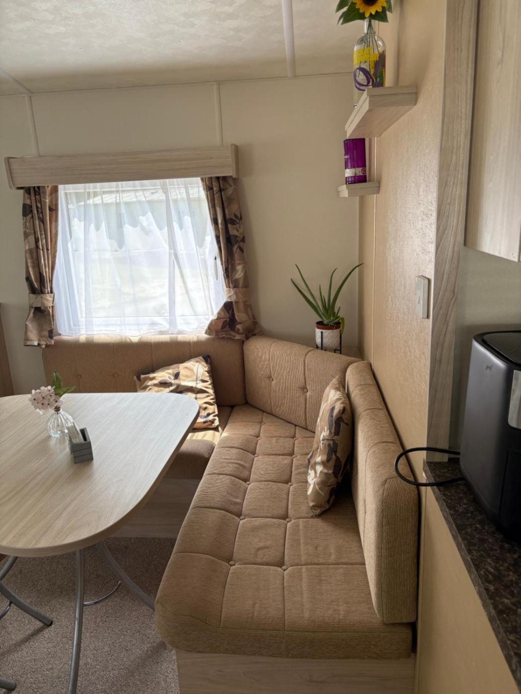 Caravan. This mobile homes special feature is the fireplace. This mobile home consists of 1 living room, 2 separate bedrooms and 1 bathroom with a shower. Guests can make meals in the kitchen that is equipped with a stovetop, a refrigerator, kitchenware and an oven. The mobile home features carpeted floors, a seating area with a flat-screen TV with streaming services, a dining area, a wardrobe, as well as an electric kettle. The unit offers 4 beds.