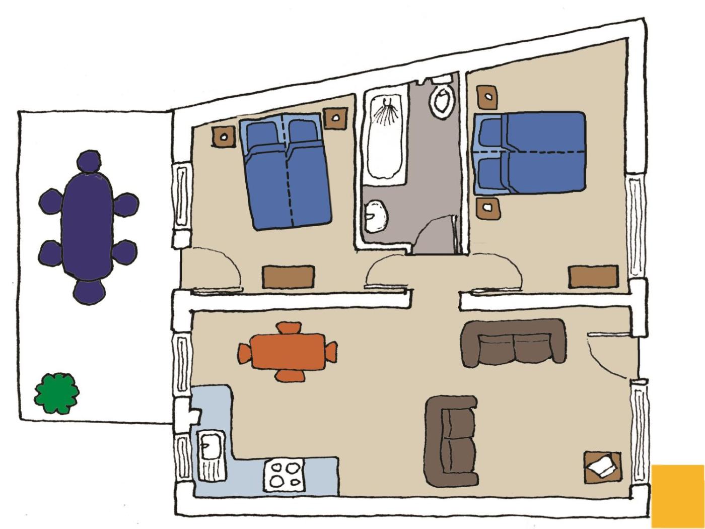 Two-Bedroom Apartment. This apartment features a satellite TV, patio and seating area. This room offers a bed with can either be a 2 single bed or 1 super king. ;
